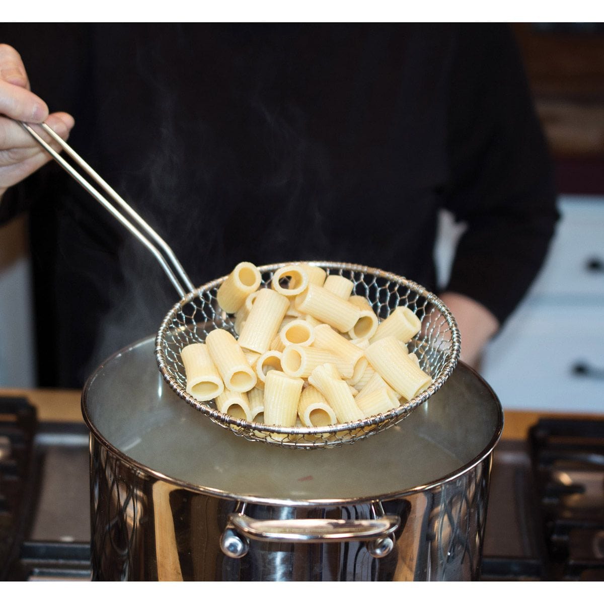 This Helen's Asian Kitchen Spider Strainer is an essential kitchen tool for safely scooping up foods and draining away hot oil and boiling liquids. Made of durable stainless steel with a satin finish handle, it won't Absorb odors, juices, or oils and won't react with foods or impart a metallic taste. Its long handle with rubberized grip offers comfort and control while the shallow mesh basket securely holds food for easy draining. Lightweight and easy to store, this strainer is an ideal kitchen tool.